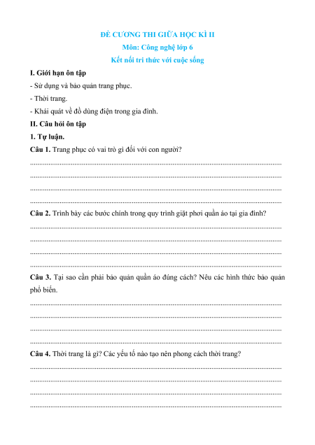 Đề cương ôn tập Giữa kì 2 Công nghệ lớp 6 Kết nối tri thức