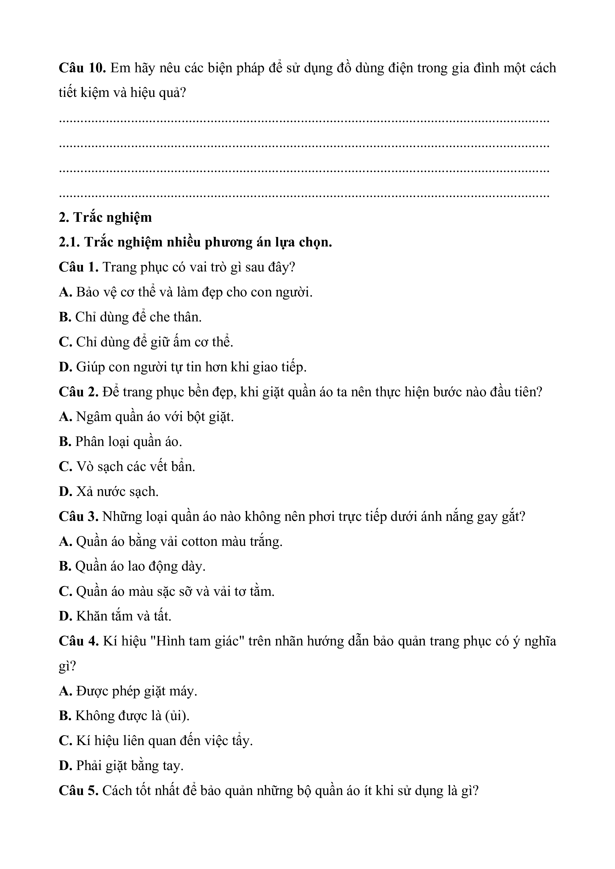 Câu 2. Để trang phục bền đẹp, khi giặt quần áo ta nên thực hiện bước nào đầu tiên?