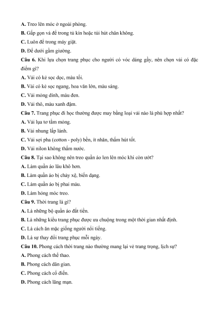 Câu 6. Khi lựa chọn trang phục cho người có vóc dáng gầy, nên chọn vải có đặc điểm gì?