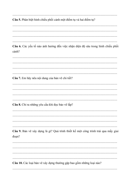 - Biểu diễn quy ước ren. - Bản vẽ cơ khí. - Bản vẽ xây dựng. II. Câu hỏi ôn tập 1. Tự luận.