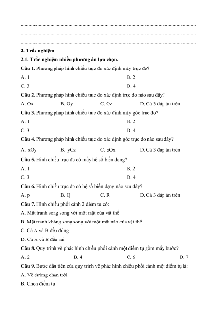 Câu 1. Phương pháp hình chiếu trục đo xác định mấy trục đo? A. 1 B. 2 C. 3 D. 4