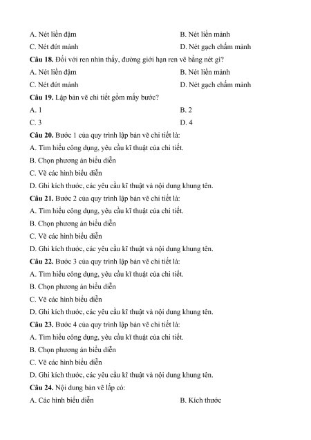 Câu 17. Đối với ren nhìn thấy, đường đỉnh ren vẽ bằng nét gì?