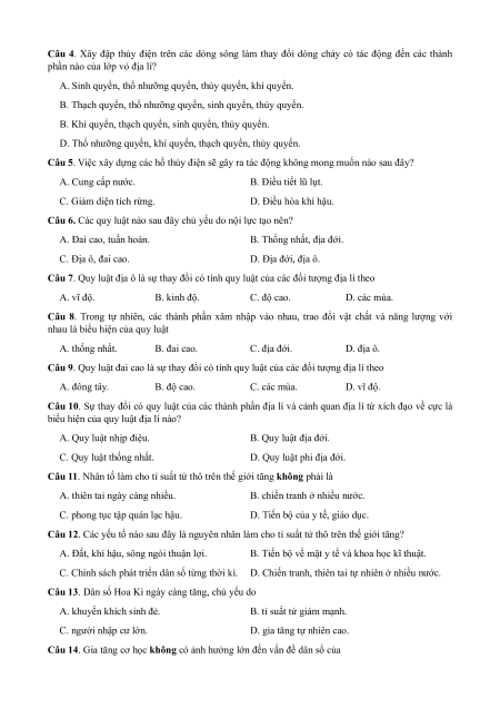 Câu 1. Lớp vỏ địa lí có giới hạn trùng hợp hoàn toàn với lớp vỏ bộ phận nào sau đây? A. Sinh quyển. B. Khí quyển. C. Thạch quyển. D. Thổ nhưỡng quyển.