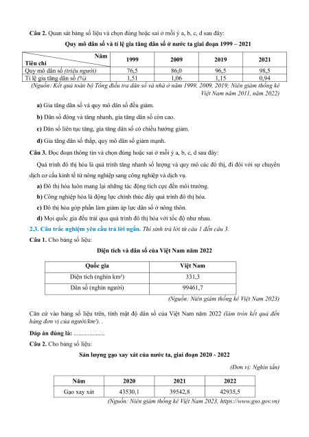 2.2. Câu trắc nghiệm đúng sai. Thí sinh trả lời từ câu 1 đến câu 3. Trong mỗi ý a), b), c), d) ở mỗi