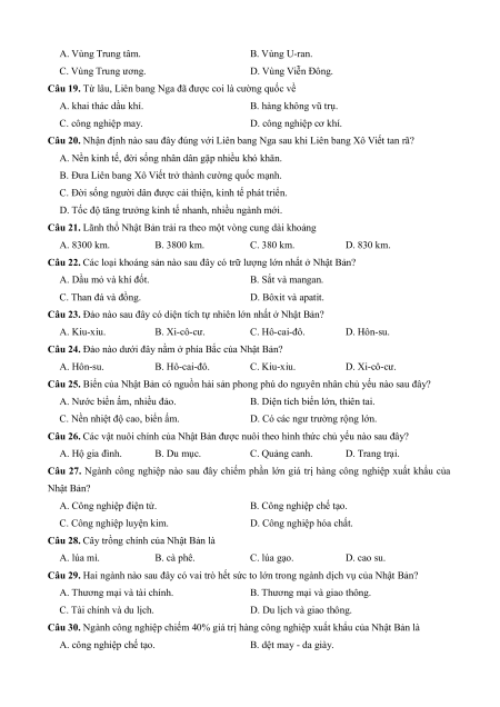 Câu 21. Lãnh thổ Nhật Bản trải ra theo một vòng cung dài khoảng A. 8300 km. B. 3800 km. C. 380 km. D. 830 km.