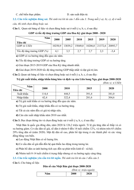 2.2. Câu trắc nghiệm đúng sai. Thí sinh trả lời từ câu 1 đến câu 3. Trong mỗi ý a), b), c), d) ở mỗi