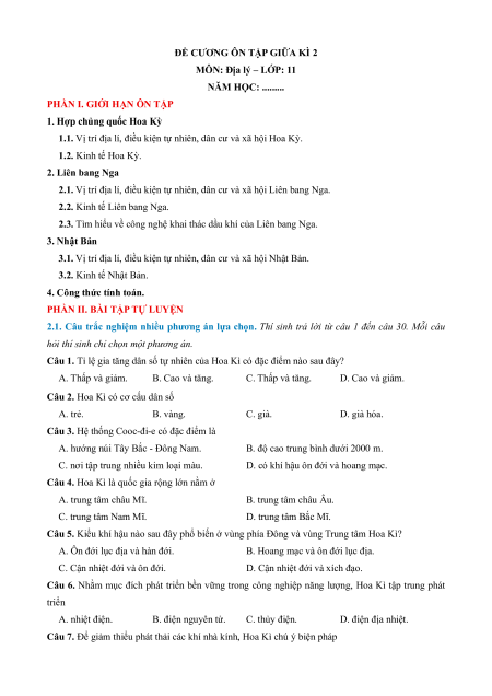 Câu 1. Tỉ lệ gia tăng dân số tự nhiên của Hoa Kì có đặc điểm nào sau đây? A. Thấp và giảm. B. Cao và tăng. C. Thấp và tăng. D. Cao và giảm.