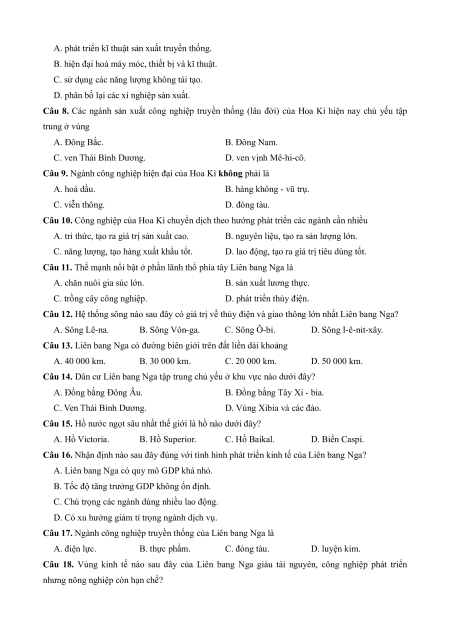 Câu 8. Các ngành sản xuất công nghiệp truyền thống (lâu đời) của Hoa Kì hiện nay chủ yếu tập trung ở vùng A. Đông Bắc. B. Đông Nam. C. ven Thái Bình Dương. D. ven vịnh Mê-hi-cô.