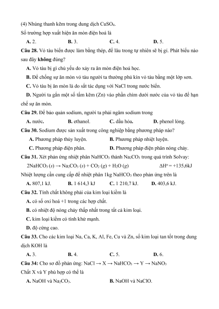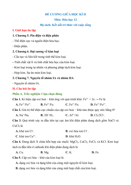 Câu 2. Giá trị thế điện cực chuẩn của cặp oxi hoá − khử nào được quy ước bằng 0? A. Na+/Na. B. 2H+/H2. C. Al3+/Al. D. Cl2/2Cl–.