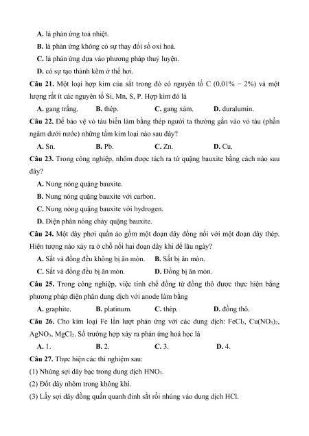 Câu 21. Một loại hợp kim của sắt trong đó có nguyên tố C (0,01% − 2%) và một