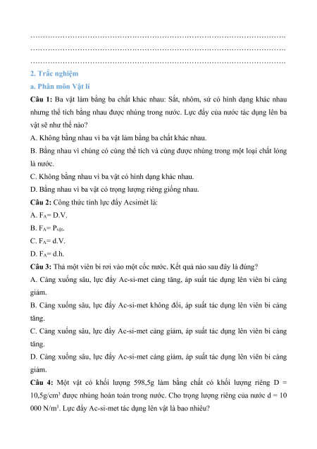 Câu 2: Công thức tính lực đẩy Acsimét là: A. FA= D.V. B. FA= Pvật. C. FA= d.V. D. FA= d.h.