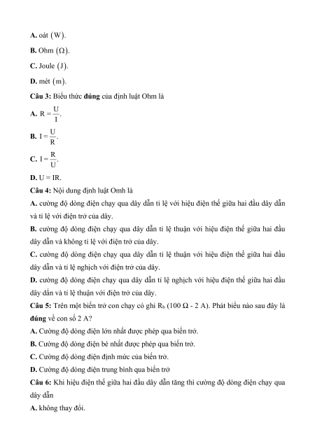 Câu 2: Đơn vị đo điện trở là A. oát W. B. Ohm . C. Joule J. D. mét m.