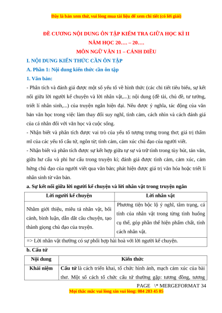 Đề cương ôn tập giữa kì 2 Ngữ văn 11 Cánh diều
