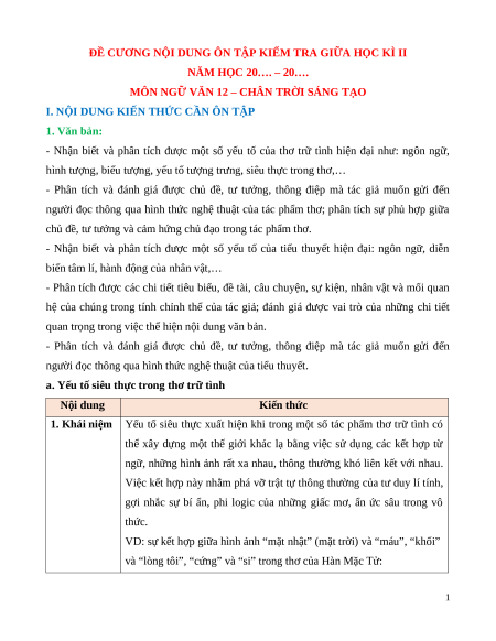 Đề cương ôn tập Giữa kì 2 Ngữ văn 12 Chân trời sáng tạo