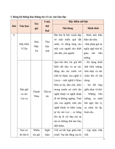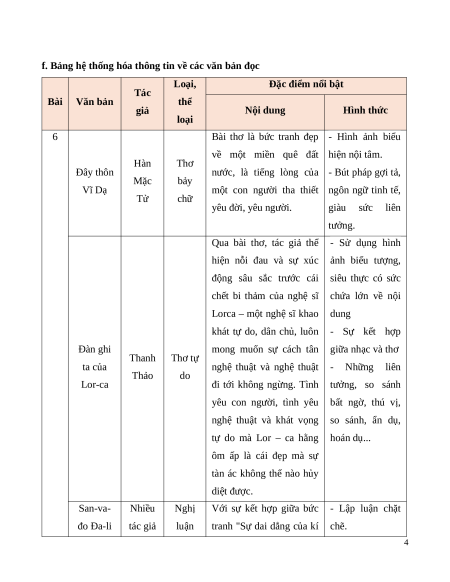 f. Bảng hệ thống hóa thông tin về các văn bản đọc Loại,