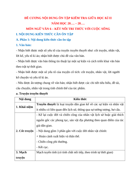 Đề cương ôn tập giữa kì 2 Ngữ văn 6 Kết nối tri thức