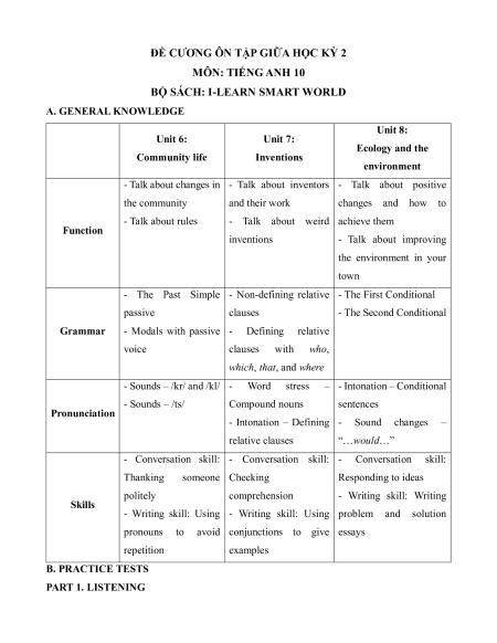 ĐỀ CƯƠNG ÔN TẬP GIỮA HỌC KỲ 2 MÔN: TIẾNG ANH 10