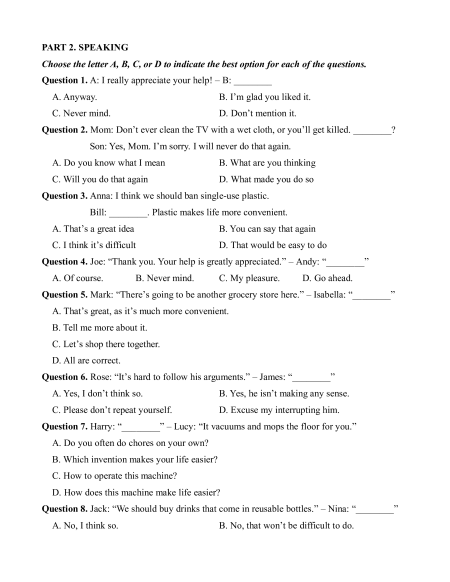 Question 1. A: I really appreciate your help! – B: ________ A. Anyway. B. I’m glad you liked it. C. Never mind. D. Don’t mention it.