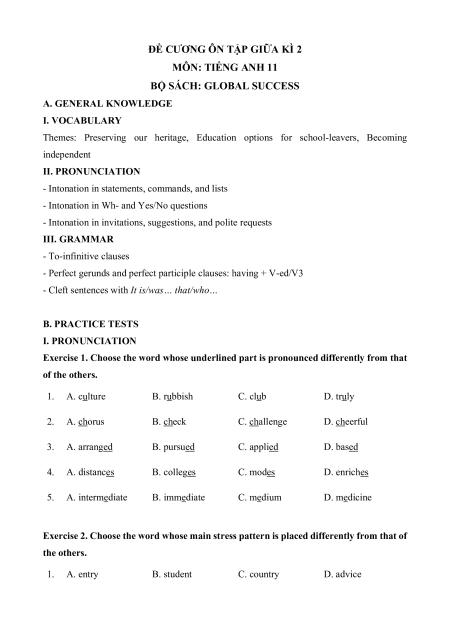 Đề cương ôn tập Giữa kì 2 Tiếng Anh 11 Global succes