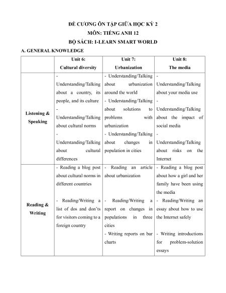BỘ SÁCH: I-LEARN SMART WORLD A. GENERAL KNOWLEDGE Unit 6: Unit 7: Unit 8: Cultural diversity Urbanization The media - - Understanding/Talking - Understanding/Talking about