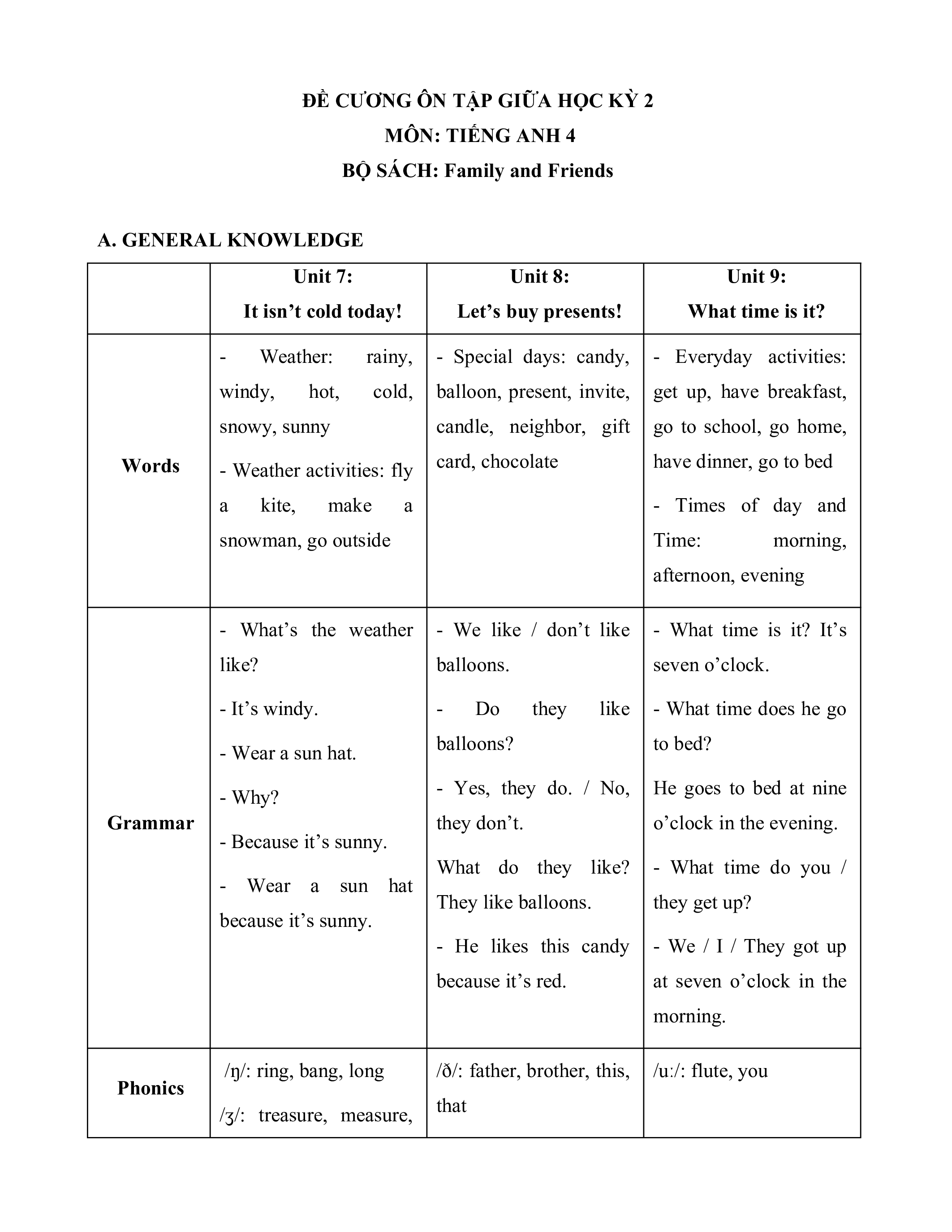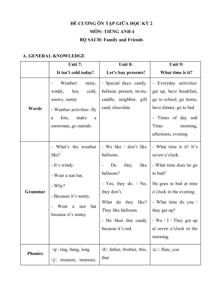 BỘ SÁCH: Family and Friends A. GENERAL KNOWLEDGE Unit 7: Unit 8: Unit 9: It isn’t cold today! Let’s buy presents! What time is it? - Weather: