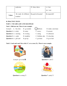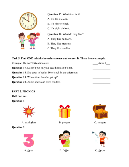 Question 20. Annie and Noah likes candles. _____________ PART 2. PHONICS Odd one out. Question 1. A. explosion B. present C. treasure Question 2. A. three B. father C. throw