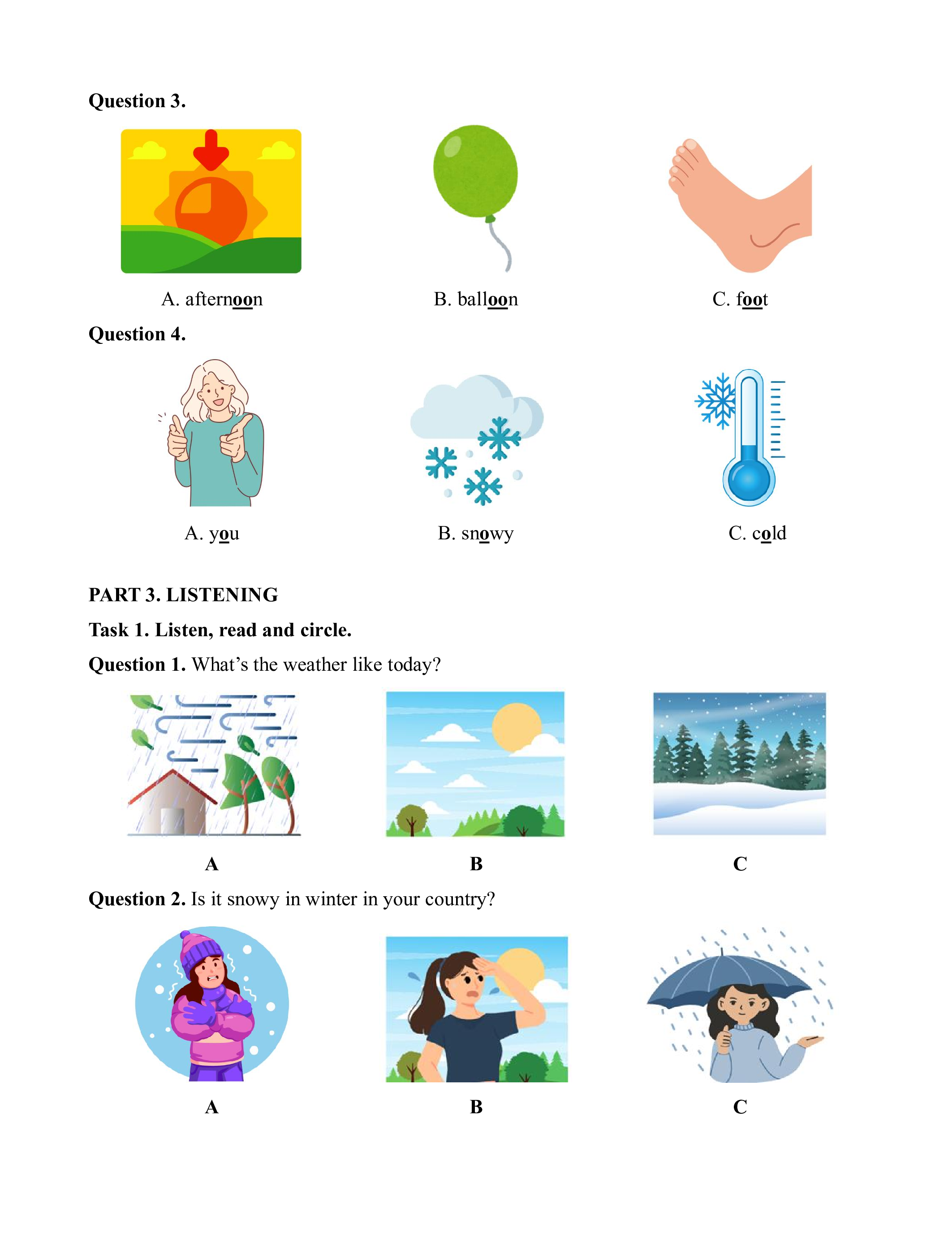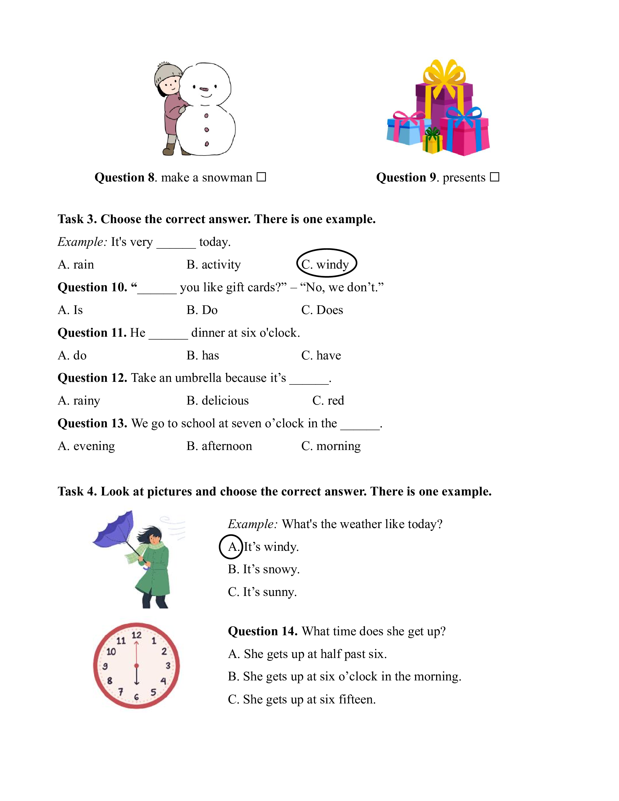 Example: A. fly a kite B. go outside C. balloons D. make a snowman Question 1. A. windy B. sunny C. snowy D. present Question 2. A. morning B. evening C. eating D. afternoon Question 3. A. candy B. neighbor C. birthday cake D. chocolate