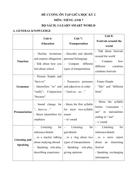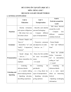 BỘ SÁCH: I-LEARN SMART WORLD A. GENERAL KNOWLEDGE Unit 8: Unit 6: Unit 7: Festivals around the Education Transportation world - Talk about festivals