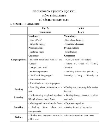 BỘ SÁCH: FRIENDS PLUS A. GENERAL KNOWLEDGE Unit 5: Unit 6: Years ahead Learn Vocabulary: Vocabulary: - Uses of “get” - Schools and exams - Lifestyle choices - Courses and careers Pronunciation: Pronunciation: - Sentence stress - Silent letters Grammar: Grammar: