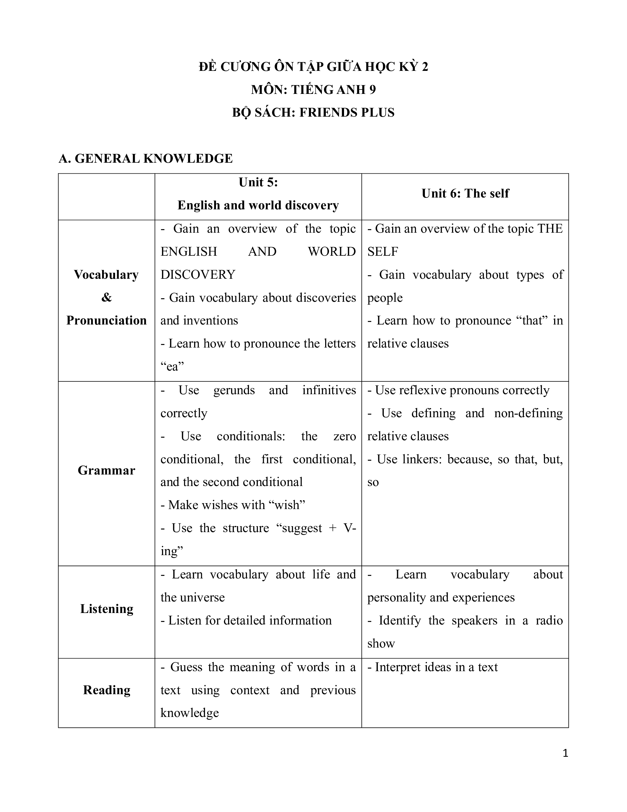 BỘ SÁCH: FRIENDS PLUS A. GENERAL KNOWLEDGE Unit 5: Unit 6: The self