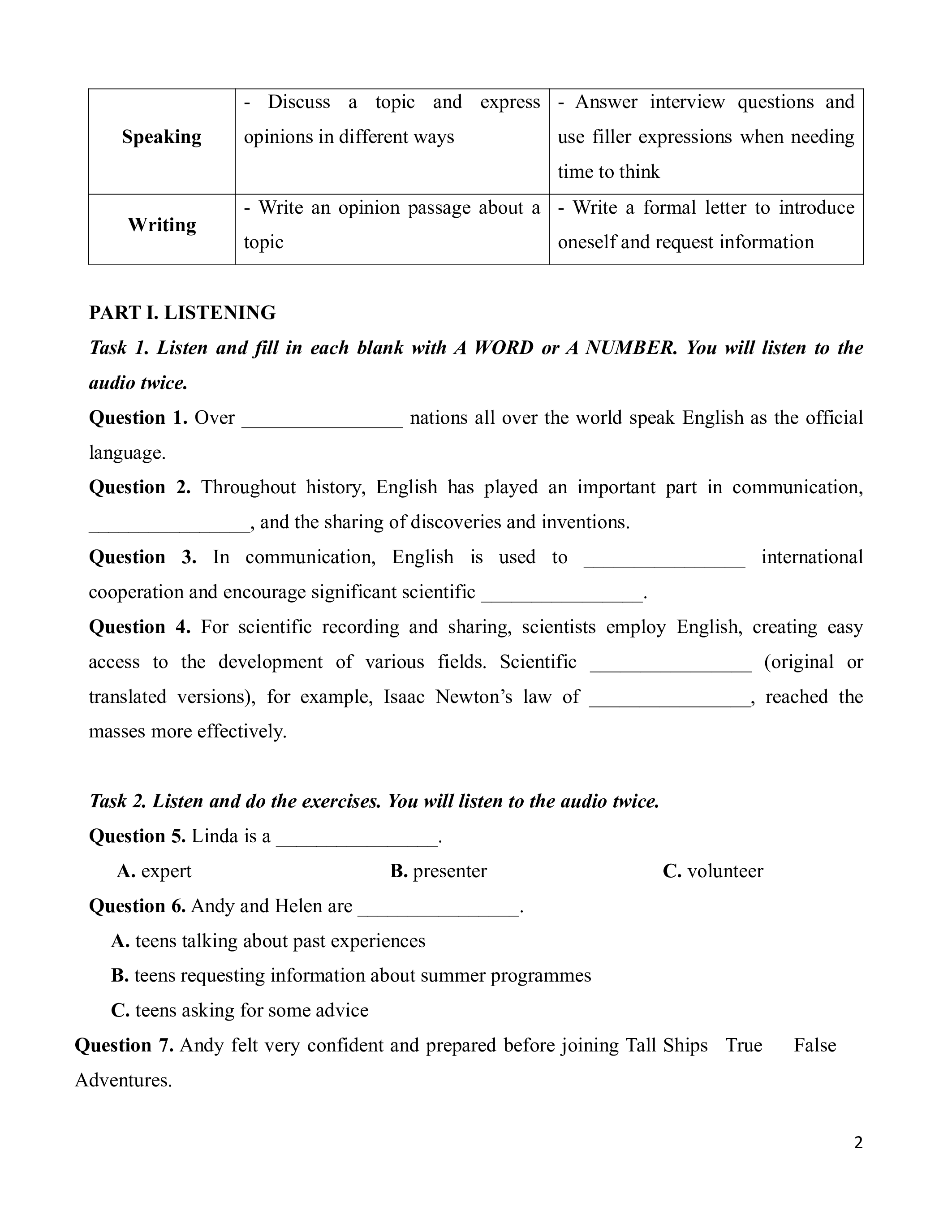 Task 1. Listen and fill in each blank with A WORD or A NUMBER. You will listen to the audio twice.