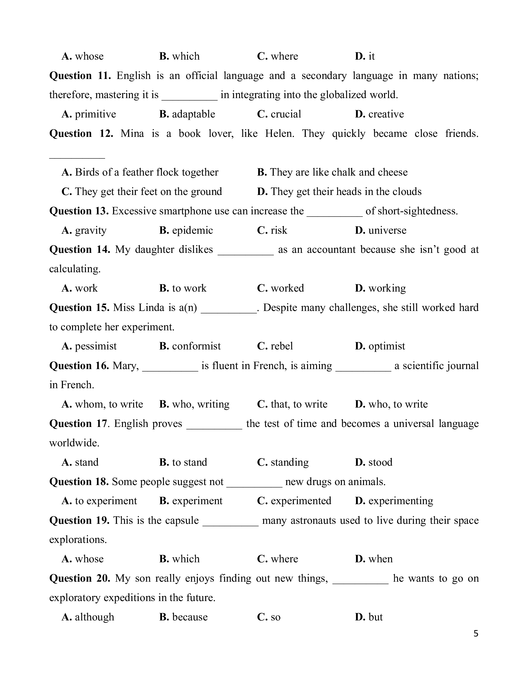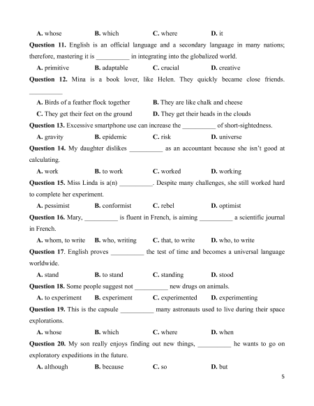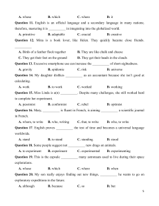 Question 11. A. exploration B. cooperate C. collaborate D. identify Question 12. A. create B. translate C. integrate D. approximate Question 13. A. fossil B. employ C. storage D. clinic Question 14. A. gravity B. complicated C. pharmacist D. promotion Question 15. A. allow B. useful C. master D. selfish Question 16. A. reward B. interest C. request D. rely 3