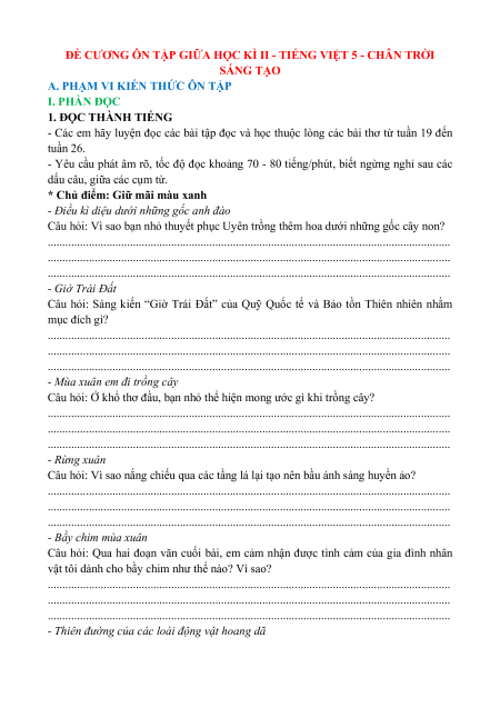 ĐỀ CƯƠNG ÔN TẬP GIỮA HỌC KÌ II - TIẾNG VIỆT 5 - CHÂN TRỜI SÁNG TẠO