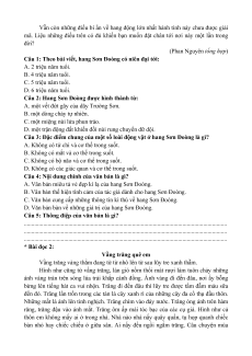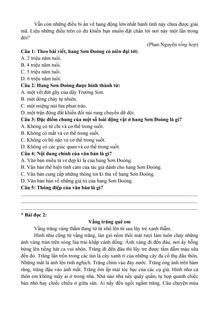Câu 1: Theo bài viết, hang Sơn Đoòng có niên đại tới: A. 2 triệu năm tuổi. B. 4 triệu năm tuổi. C. 5 triệu năm tuổi. D. 6 triệu năm tuổi.