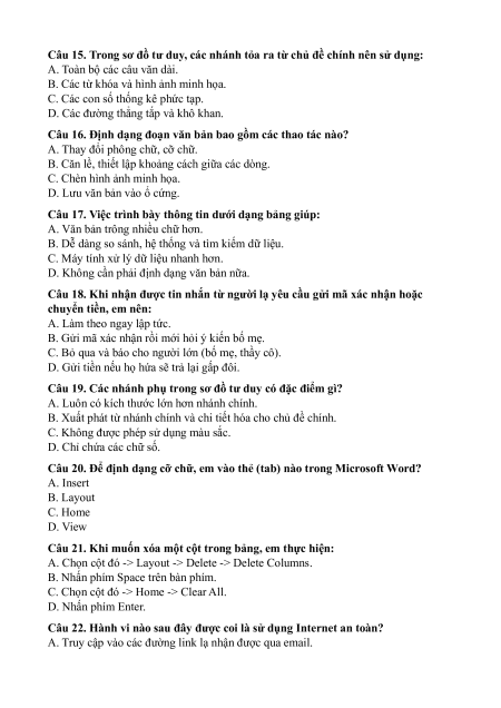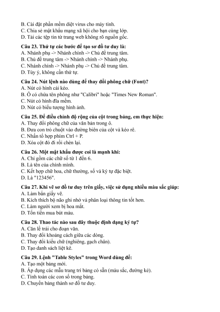 Câu 27. Khi vẽ sơ đồ tư duy trên giấy, việc sử dụng nhiều màu sắc giúp: A. Làm bẩn giấy vẽ.