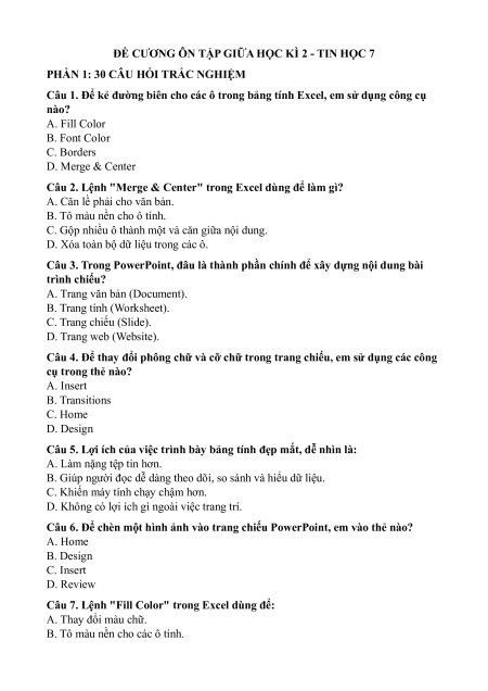 Câu 7. Lệnh "Fil Color" trong Excel dùng để: A. Thay đổi màu chữ.