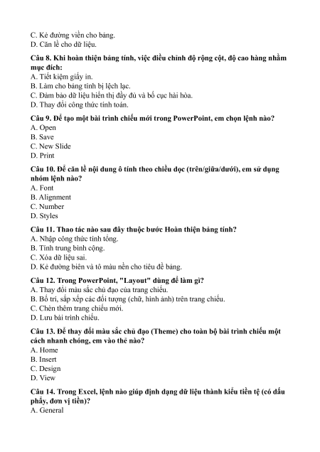Câu 5. Lợi ích của việc trình bày bảng tính đẹp mắt, dễ nhìn là: A. Làm nặng tệp tin hơn.