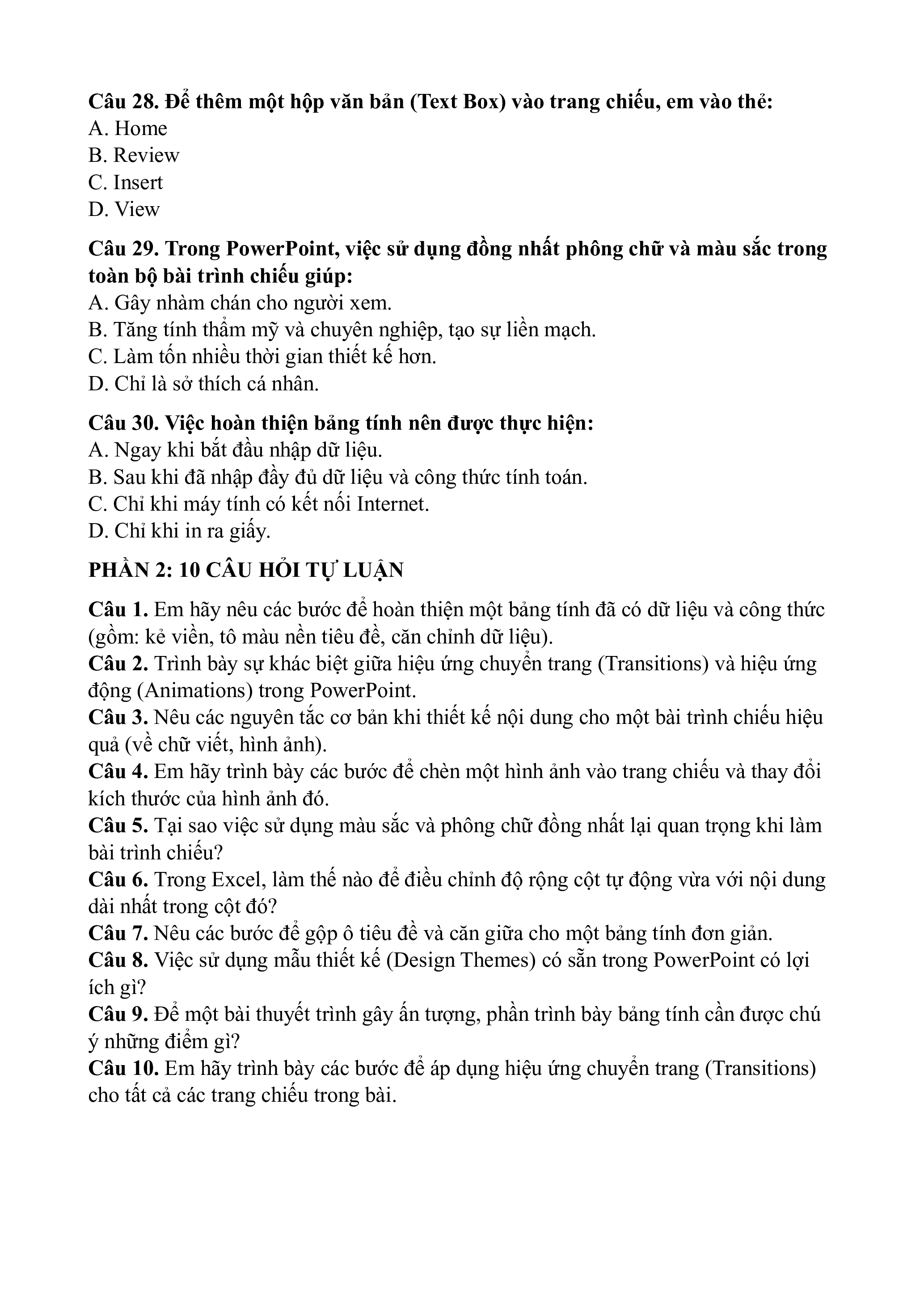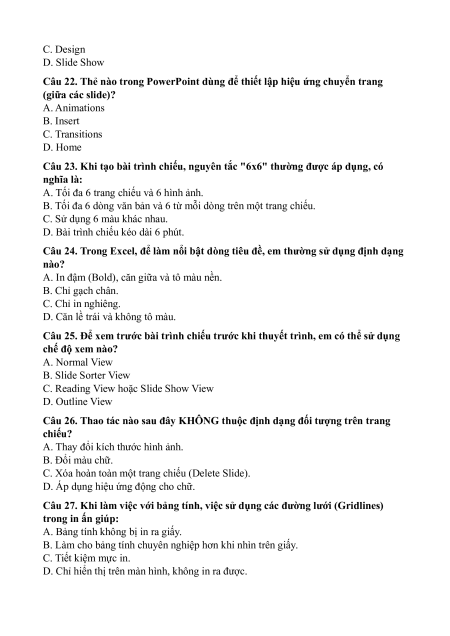 Câu 22. Thẻ nào trong PowerPoint dùng để thiết lập hiệu ứng chuyển trang (giữa các slide)? A. Animations B. Insert C. Transitions D. Home