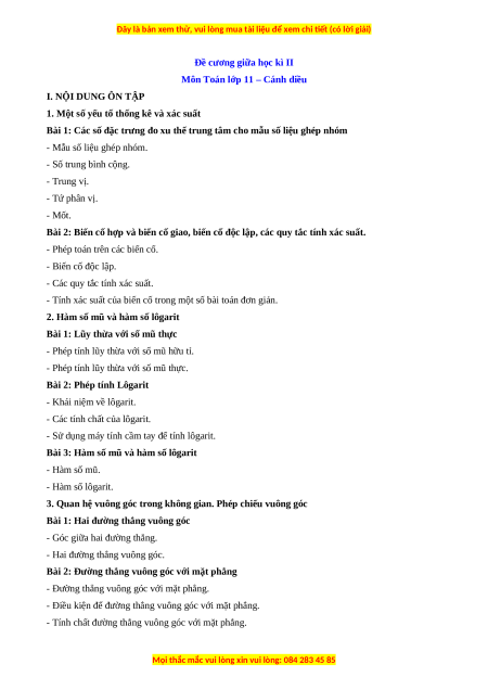 Môn Toán lớp 11 – Cánh diều I. NỘI DUNG ÔN TẬP
