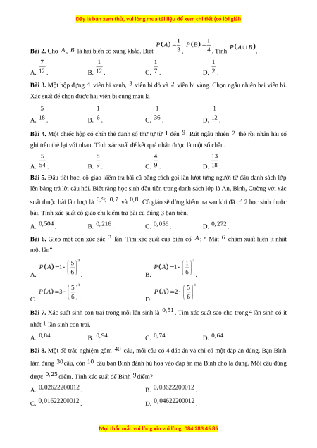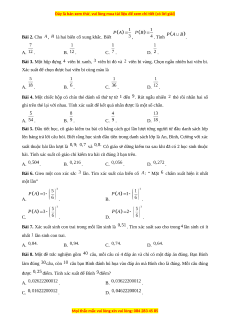 Bài 2. Cho , là hai biến cố xung khắc. Biết , . Tính . A. . B. . C. . D. .
