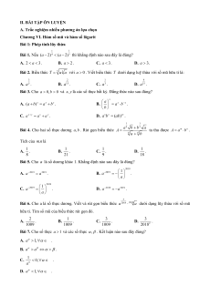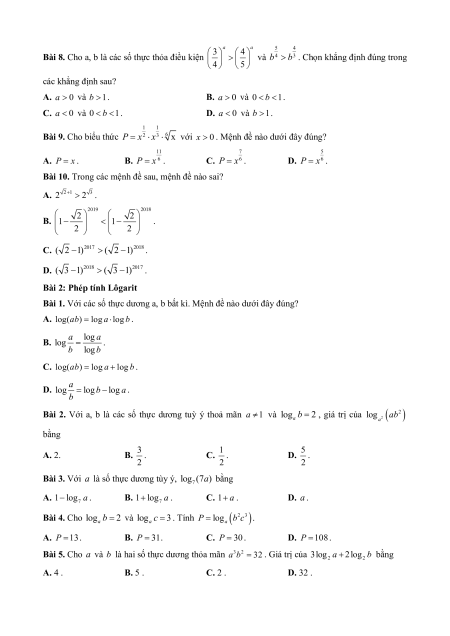 Bài 7. Cho số thực a 1 và các số thực , . Kết luận nào sau đây đúng?