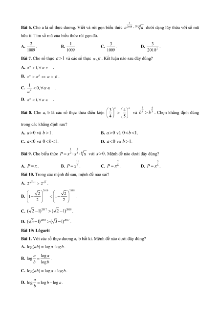 Bài 10. Trong các mệnh đề sau, mệnh đề nào sai? A. 2 1 3 2 2 . 2019 2018 B. 2 2 1 1 . 2 2 C. 2017 2018 ( 2 1) ( 2 1) . D. 2018 2017 ( 3 1) ( 3 1) . Bài 19: Lôgarit