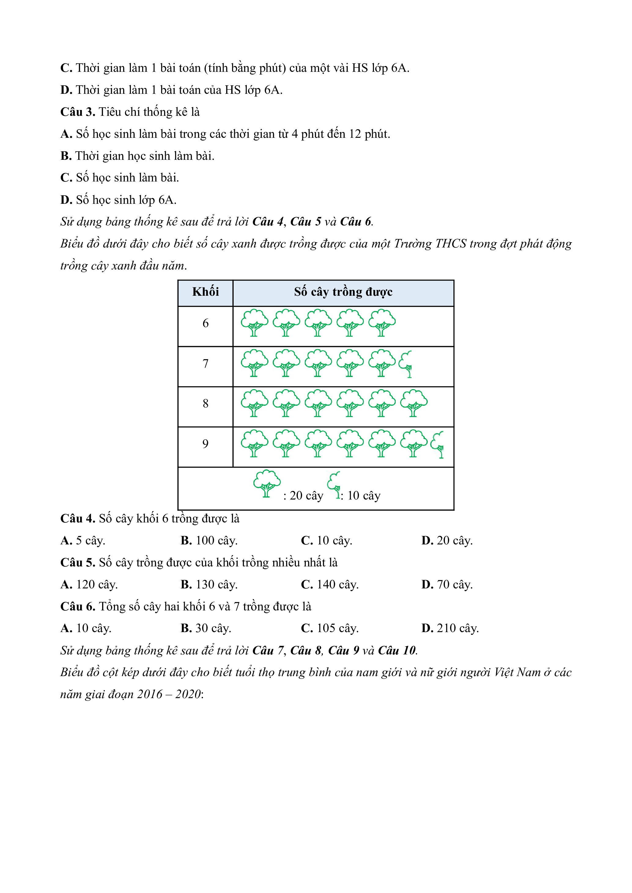 Câu 6. Tổng số cây hai khối 6 và 7 trồng được là A. 10 cây. B. 30 cây. C. 105 cây. D. 210 cây.