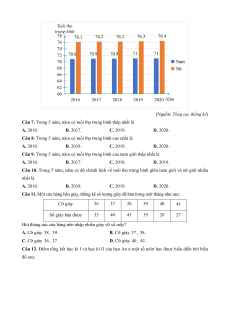 Câu 10. Trong 5 năm, năm có độ chênh lệch về tuổi thọ trung bình giữa nam giới và nữ giới nhiều nhất là A. 2016. B. 2018. C. 2019. D. 2020.