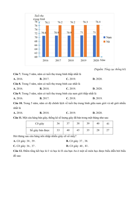 Câu 9. Trong 5 năm, năm có tuổi thọ trung bình của nam giới thấp nhất là A. 2016. B. 2017. C. 2018. D. 2019.
