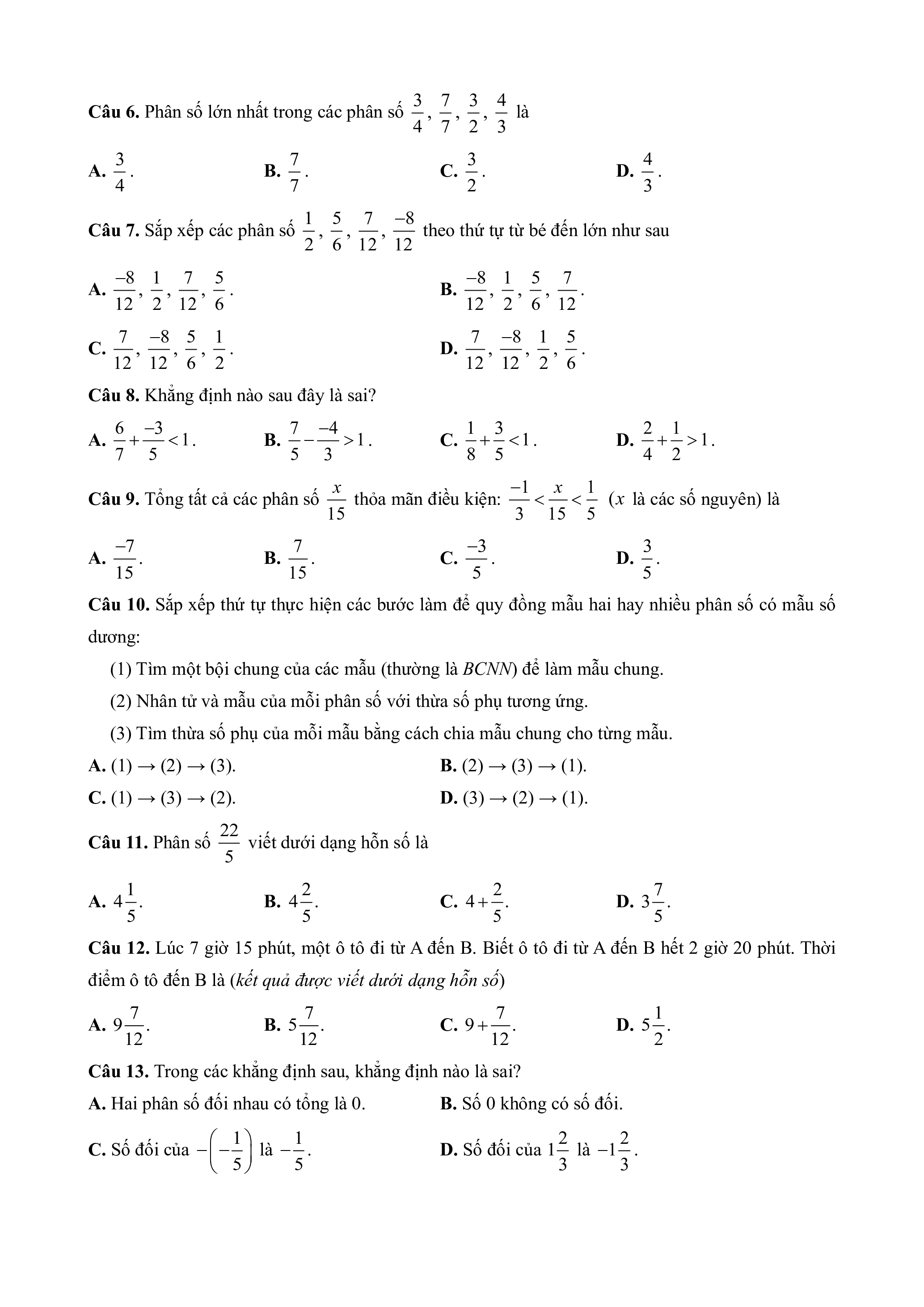Câu 6. Phân số lớn nhất trong các phân số 3 , 7 , 3 , 4 là 4 7 2 3 A. 3 . B. 7 . C. 3 . D. 4 . 4 7 2 3