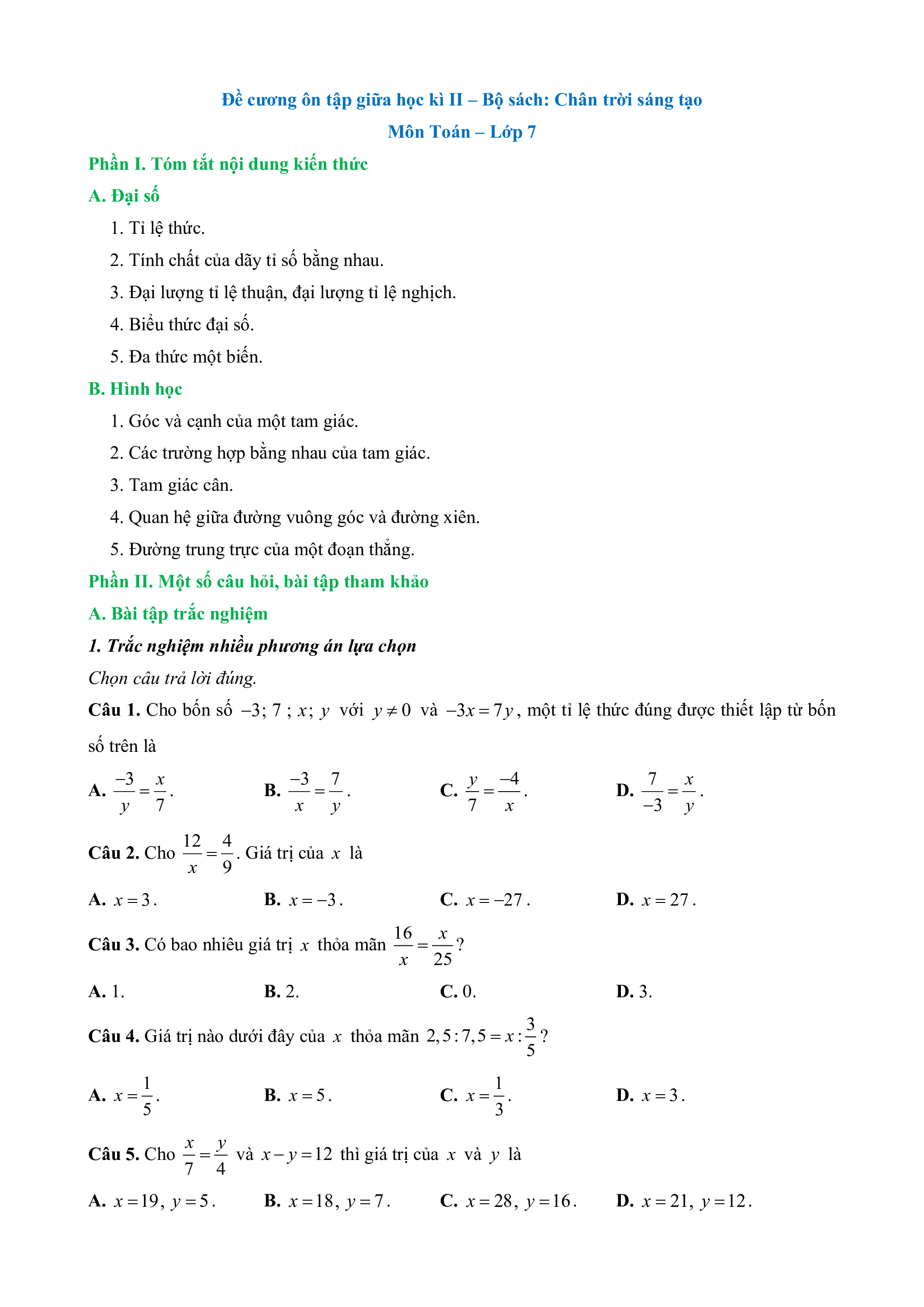 Đề cương ôn tập giữa học kì II – Bộ sách: Chân trời sáng tạo Môn Toán – Lớp 7