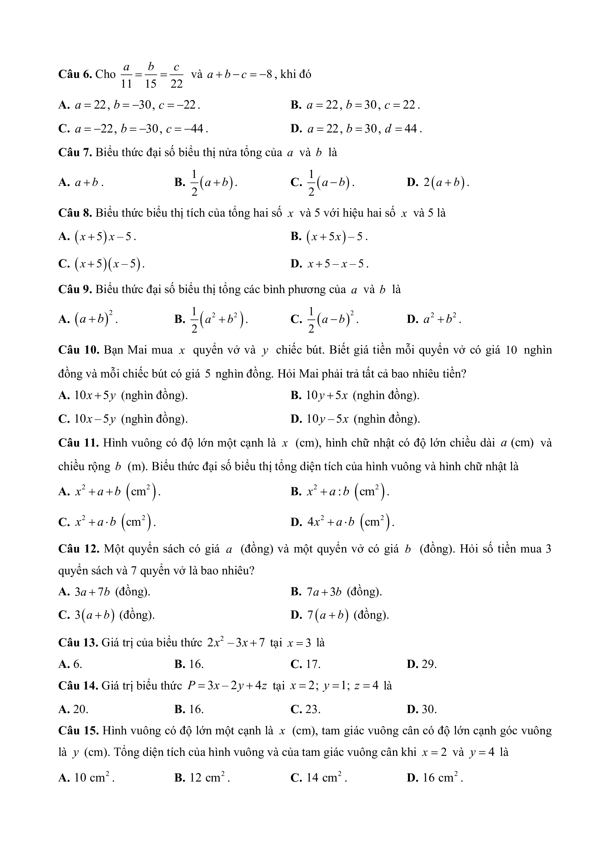 3. Đại lượng tỉ lệ thuận, đại lượng tỉ lệ nghịch. 4. Biểu thức đại số. 5. Đa thức một biến. B. Hình học