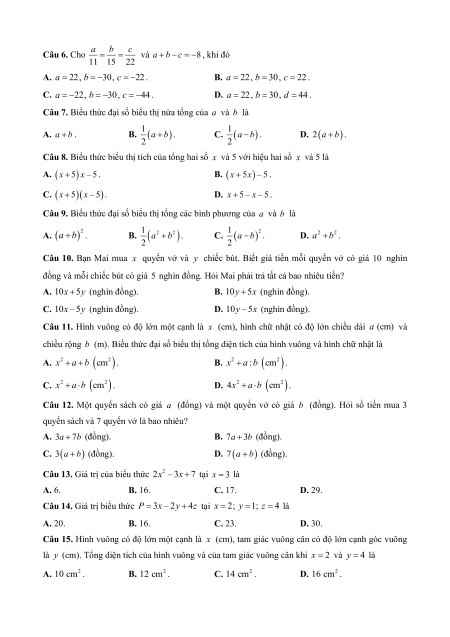 Câu 7. Biểu thức đại số biểu thị nửa tổng của a và b là A. a 1 1 b .