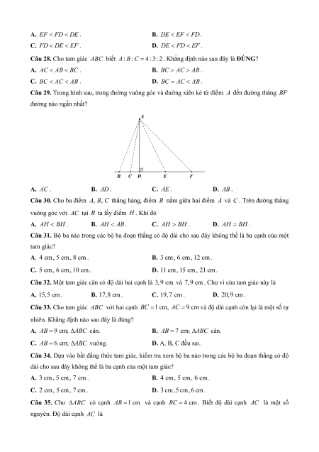 Câu 34. Dựa vào bất đẳng thức tam giác, kiểm tra xem bộ ba nào trong các bộ ba đoạn thẳng có độ